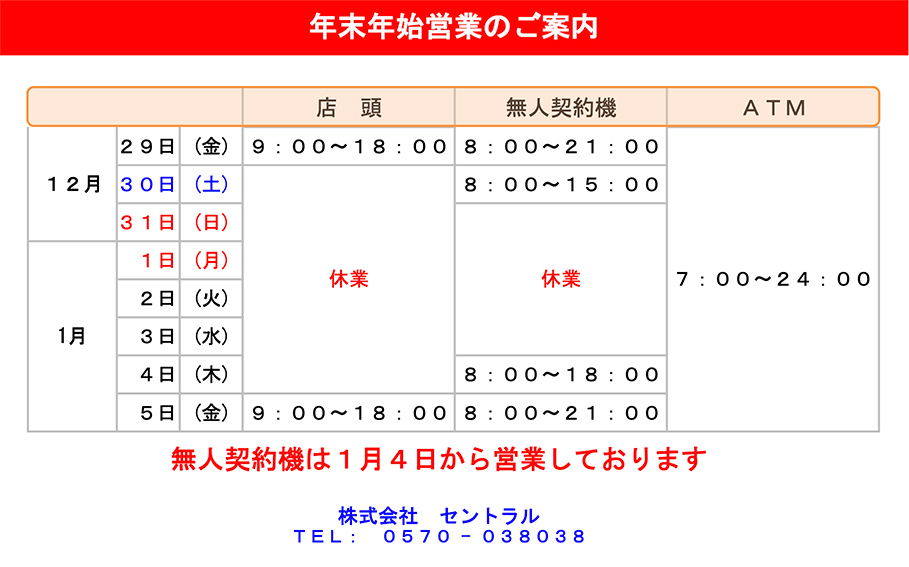 年末年始における営業時間につきまして、以下のとおりご案内させていただきますので、