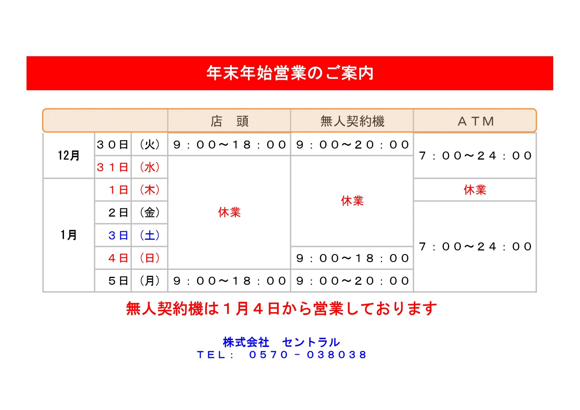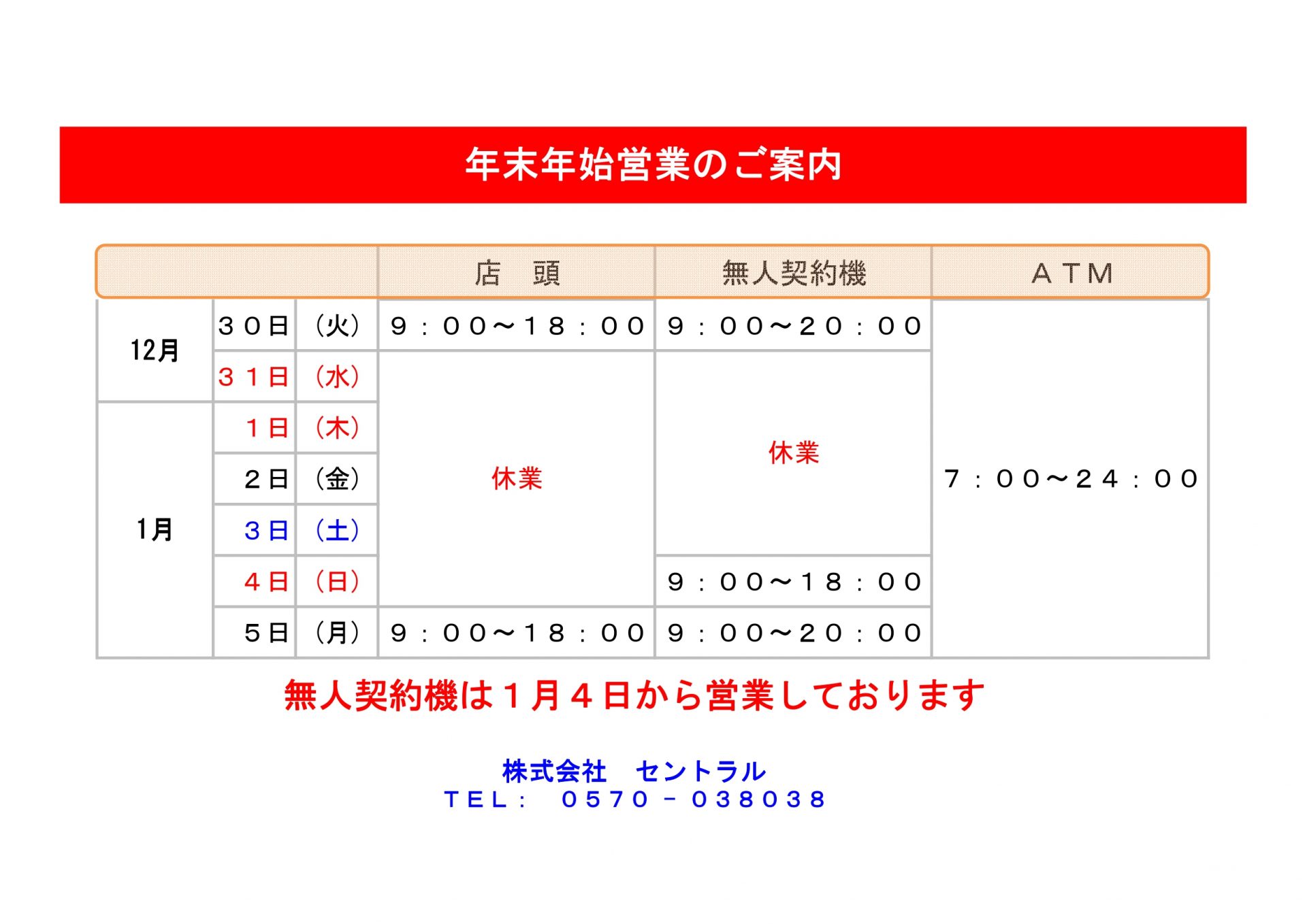 年末年始営業のご案内 2025年12月22日 平素は格別のお引き立てを賜り誠にありがとうございます。 年末年始における営業時間につきまして、以下のとおりご案内させていただきますので、ご確認をお願いいたします。弊社ATM・提携ATM(セブン銀行)は年中無休です。お客さまには大変ご迷惑をおかけいたしますが、何卒ご理解いただきますようお願い申し上げます。 営業時間 営業時間(梅田店)